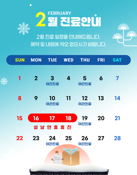 월 수 금 : AM 10:00 ~ PM 7:00 화 목 : AM 10:00 ~ PM 9:00 (야간진료) 토 요 일 : AM 9:30 ~ PM 1:30 (점심시간 없이 진료) 점심시간 : PM 1:00 ~ PM 2:00 일요일, 공휴일은 휴진입니다.