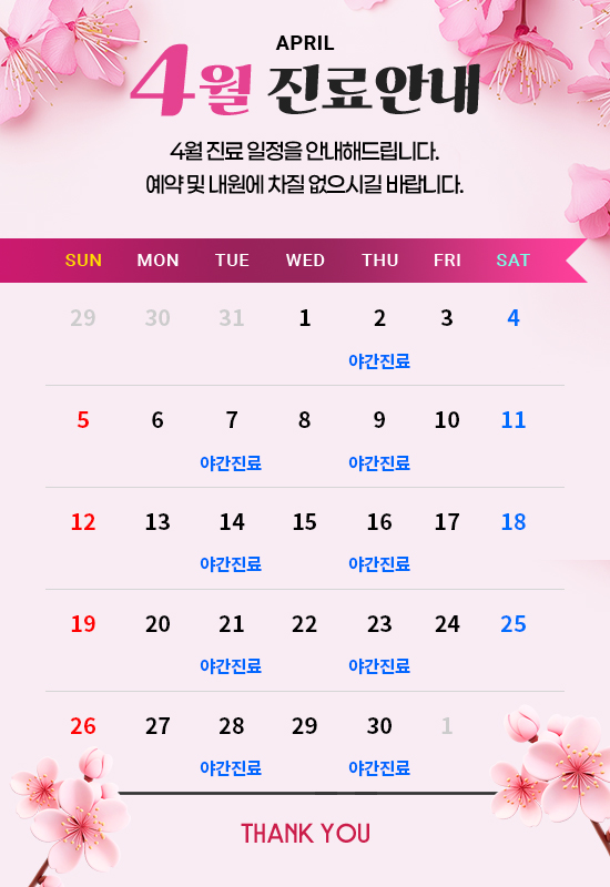 월 수 금 : AM 10:00 ~ PM 7:00 화 목 : AM 10:00 ~ PM 9:00 (야간진료) 토 요 일 : AM 9:30 ~ PM 1:30 (점심시간 없이 진료) 점심시간 : PM 1:00 ~ PM 2:00 일요일, 공휴일은 휴진입니다.