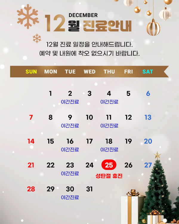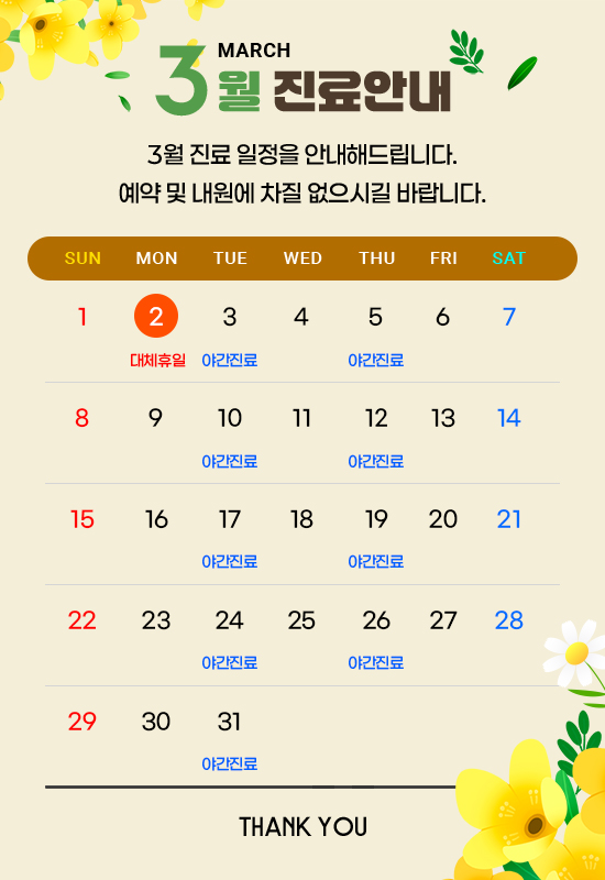 월 수 금 : AM 10:00 ~ PM 7:00 화 목 : AM 10:00 ~ PM 9:00 (야간진료) 토 요 일 : AM 9:30 ~ PM 1:30 (점심시간 없이 진료) 점심시간 : PM 1:00 ~ PM 2:00 일요일, 공휴일은 휴진입니다.